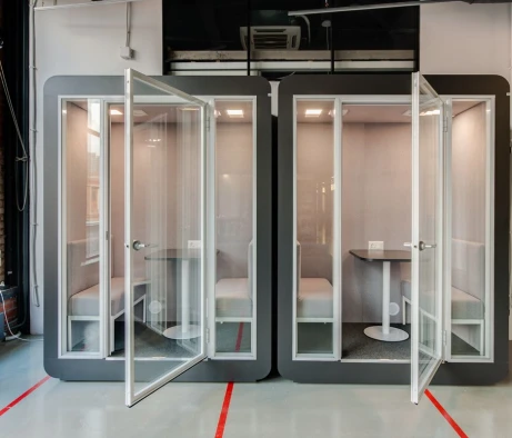 Высококачественные материалы и внимание к деталям обеспечили высокий уровень шумоизоляции, что крайне важно для комфортной работы в условиях офиса. Каждая кабина оснащена всем необходимым для удобства сотрудников: розетками, USB-портами, разъёмами Type-C, встроенным столиком и удобными местами для сидения. Для поддержания комфортного микроклимата предусмотрена система вентиляции, что позволяет использовать кабины продолжительное время без потери комфорта.